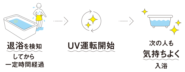 入浴の状況に応じて自動でUV運転を開始。給湯器が浴槽のお湯を取り込み、UVを照射。UV照射されたお湯を再度浴槽に送るので、次の人も気持ちよく入浴。