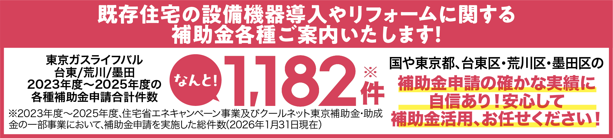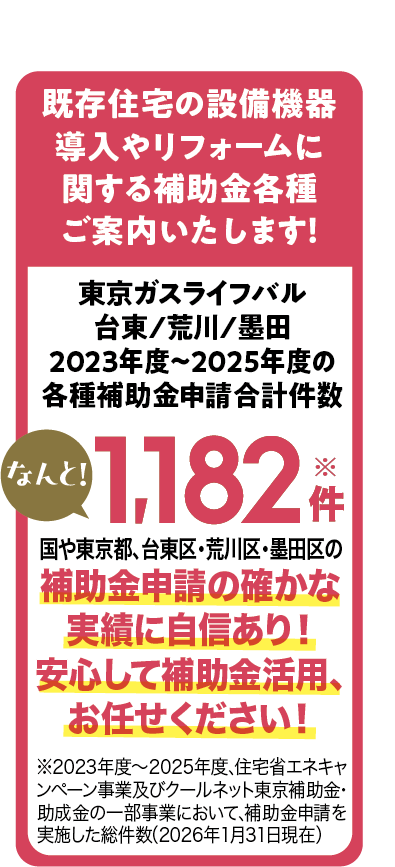 ご安心ください。補助金申請実績豊富な、私たち東京ガスライフバル台東/荒川/墨田が、煩雑な書類作成や申請など丸ごとサポート!