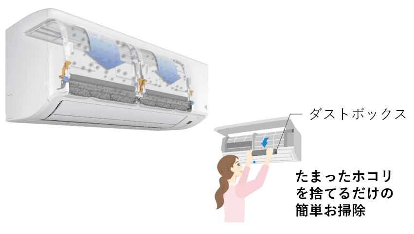 ダストボックスのホコリの収容量※は、2.2~5.6kWクラスは約3年分。6.3~7.1kWクラスで約10年分。使用環境により汚れ具合が異なるため、1年毎のお手入れをおすすめします。