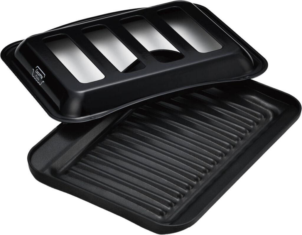 遠赤外線と近赤外線の効果でこんがりおいしく。ココットプレート調理なら、スリットから飛び散る油を800℃のバーナーで焼き切ります。