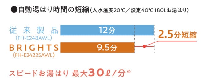 BRIGHTSシリーズは、最大湯量の上限がアップされ、自動湯はりの時間がスピードアップしました。入浴待ち時間が短くなり、一刻も早く入浴したいタイミングに対応します。