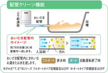 フルオートタイプなら「排水時」、オートタイプなら「自動運転終了時」においだき配管内にきれいなお湯または水を流します。おいだき配管の残り湯を流し出すことで、配管内の水アカの発生を軽減します。