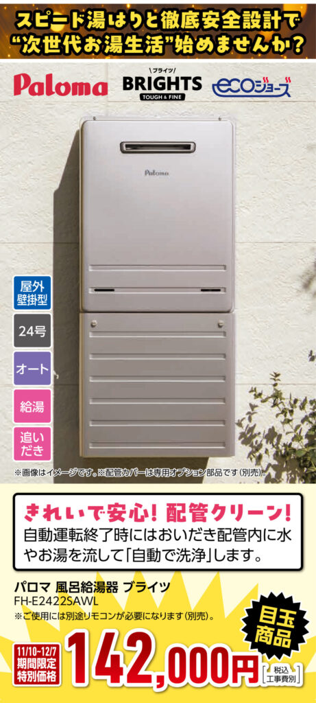 - 割引対象機種…風呂給湯器(屋外タイプ)、暖房風呂給湯器(屋外タイプ)※追いだき機能がついていない給湯器、小型湯沸器は除く