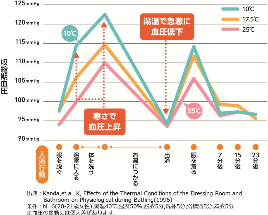浴室の室温と、湯温の差があると、血圧の変動が大きくなる傾向があり、ヒートショックのリスクが高まると考えられます。