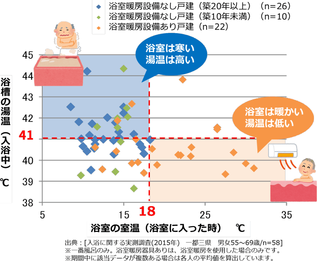 浴室における浴槽の湯温は41℃以下が推奨されています。注3)しかし、湯温を41℃以上に設定されている方の中には、浴室の室温が低い方もいるようです。